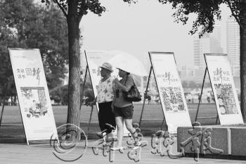 27日,在五四广场,一排“中国梦”系列宣传展架吸引了行人的目光。据了解,为了配合创城工作,市文明办在五四广场南广场的喷泉两侧各放置了一排“中国梦”系列宣传展架,内容以剪纸、年画等传统艺术为主。