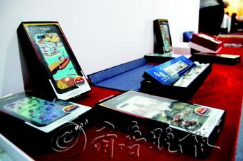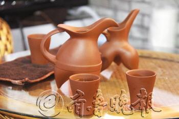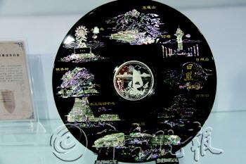 | 以日照出土的陶鬹为造型的紫砂茶壶。 |  | 以日照农民画元素制作的手机壳,被摆放在展位显眼位置。 |  | 带有日照元素的贝壳漆器。 |