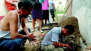 | 李令宪(左一)在现场询问水管施工情况。 本报记者 张建丽 摄 |