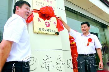 8月28日,本报《今日长清》首个新闻记者联络点挂牌仪式在济南济华燃气公司位于长清区龙泉路的客服中心举行。图为济华燃气公司总经理范杰民(图左)与长清区委宣传部副部长王新勇(图右)为记者联络点揭牌。 本报记者 董从哲 摄
