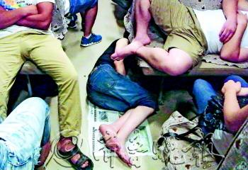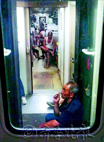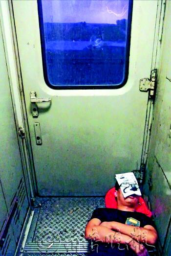 | ◤车厢连接处,一名乘客用画报盖住脸沉睡着。车窗外正划过一道闪电。 |  | ▲老式车厢的连接处设有吸烟处,一名老人默默地抽着烟。 |  | ▲给孩子留出尽可能大的空。 |  | ◥熟睡和醒着的女郎。 |  | ▲困倦到极限,处处可当床。 |