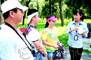 29日,曲阜三孔景区内,一名导游正在讲解“文明游客”评选活动。今年起,曲阜三孔景区将每年评选1000名“文明游客”进行物质奖励,其中表现突出的100名文明游客还将获得次年免费游览三孔景区的奖励。 本报记者 李岩松 摄