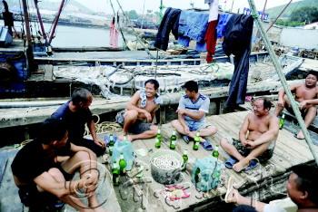 | 29日,开发区初旺港,出海前,几个河南来的老乡趁着有时间坐在一起聚聚。他们说,开海后就不会像现在一样有时间喝酒聊天了。 本报记者 李泊静 摄 |