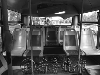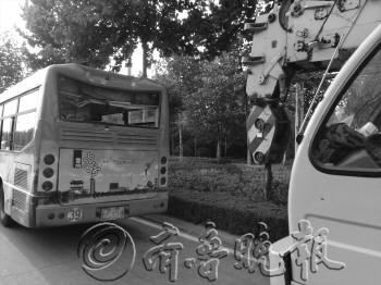 | 事发时公交车后排无乘客,没有造成人员伤亡。 |  | 破碎的公交车玻璃散落在车座上。 |  | 吊车与公交车相撞,公交车后窗被撞碎。 |