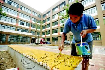 本报记者 张晓鹏 摄 |  | ▲29日,在二中分校,工人用油漆粉刷操场边的休闲座椅。