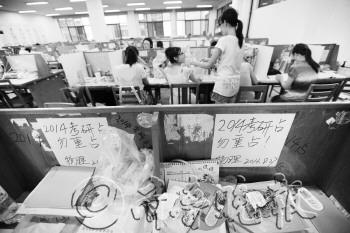28日,在青岛大学图书馆一楼一自习室内,准备考研的学生一早就来到自习室占座。日前,岛城各高校陆续开学,准备考研的同学早早开工,早上四五点就起床等着占座,自习室一座难求。