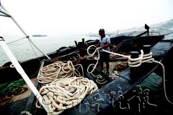| 图一:29日,在沙子口渔港码头,一位渔民在船上检查出海所需的绳索。