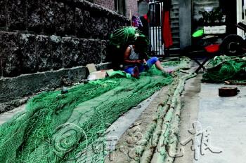 本报见习记者 杨广帅 摄 |  | 图二:一名渔民在缝补渔网以备出海。