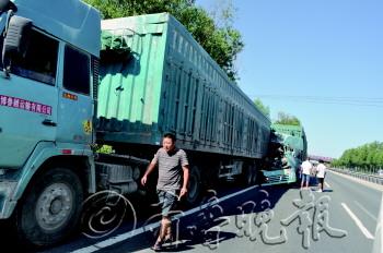 26日,省道239阳信大济路白杨河路段,两大货车追尾,后车车头损坏严重。经调查,原来是行驶中后车跟得太紧,前车遇情况刹车时,后车来不及刹车,发生碰撞。 本报记者 刘涛 通讯员 陈德泽 张立勇 摄影报道