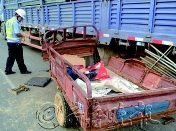 20日下午,沾化古城镇永管路路口处,一辆三轮摩托车与一辆货车相撞。经调查,原来是货车停在路边检修,三轮车司机误以为货车处于运行状态,临近时刹车未及撞了上去。 本报记者 刘涛 通讯员 张云梓 平子敏 摄影报道