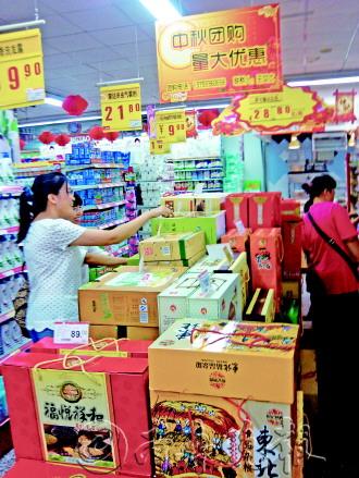 随着中秋节临近,众多商品的礼盒装大量上市。29日,纪念路一家超市内,山鸡蛋及德州扒鸡等礼盒产品大增,跃居显眼货架。