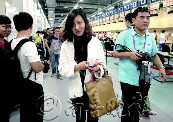 | 杜丽关注射击比赛进程。 本版照片均为本报记者 王鸿光 摄 |