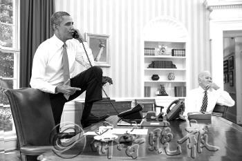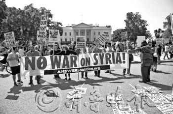 | 8月31日,美国总统奥巴马在白宫与众议长博纳通话磋商叙利亚问题,他十分豪气地用脚踩桌子,旁边是副总统拜登。 东方IC供图 |  | 8月31日,一名叙利亚小难民抵达土耳其境内。(国际) |  | ▼8月31日,在美国首都华盛顿,人们手持横幅和标语在白宫前抗议。 新华/法新