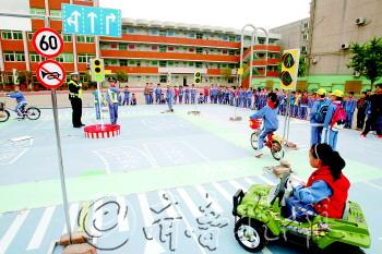 | 交警在小学校园内制作“微缩”路口,举办路口交通模拟演练,教给孩子们安全过马路。(资料片) |  | 8月30日早晨,山师东路通往山师二附中的路上,摊贩的车辆以及送孩子的车辆交织在一起,令交通十分拥堵。