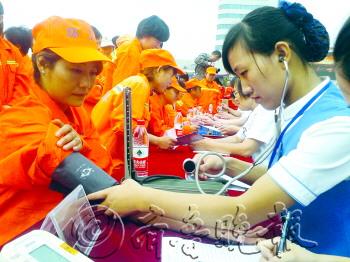 8月30日,济宁市第一人民医院启动“关爱环卫工人、共促五城同创”公益活动,现场为百名环卫工人进行义诊。同时还向1200名环卫工人赠送免费体检卡。图为公益活动义诊现场。