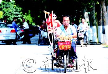 每到一地,用邮戳记录足迹 9月1日上午9时,张庆利坐在手摇式轮椅上,正在新体育馆广场树荫下乘凉。轮椅车筐上贴着“摇轮椅走全国第一人——无腿行者”,轮椅后面的木竿上系着一面五星红旗。张庆利穿着浅蓝色衬衫,稀疏的络腮胡子,双手布满了老茧。由于下肢截肢,他的裤管里安装着肉色的塑料假肢。“从平阴到东平的路上受凉了,一直流鼻涕,应该是感冒了。”虽然张庆利的鼻音很重,但仍一脸的笑容。 张庆利今年38岁,老家在辽宁省新民市。11岁时因在野外严重冻伤,膝盖以下被截肢,一直靠父亲打工养活自己。“我在电视上看到一位60岁的老人骑行全国,对我触动很大,我也想用行动去感染别人,帮助别人。”2005年,他决定不再依靠父亲生活,要自己出来闯荡。从开始时拖着假肢“跪行”,到坐上残联赠送的手摇轮椅,如今,张庆利游历了国内几乎所有省份,还去过泰国、老挝、尼泊尔。 “每到一个城市,我都会找当地邮局盖邮戳,这些都是我珍贵的收藏,证明我来过。”张庆利从轮椅座位下掏出两个大本子,翻开一看,密密麻麻都是全国各地的邮戳和支持者的祝福,邮戳时间从2008年9月19日一直延续到2013年8月31日。随后,在记者的带领下,张庆利摇着轮椅来到济宁市邮政局。工作人员听完他的故事后,拿起邮戳在本子上端正的按了下去。“真漂亮!”张庆利捧起本子,吹干了墨迹。 坚持梦想,再困难也不放弃 没有生活来源,张庆利的旅行全靠社会好心人的捐助。为了节省成本,他几乎不住旅馆,夜里就睡在轮椅上,100元钱可以支持他生活一星期,行走700多公里。“听说我感冒了,刚才一位谢先生还塞给我一盒感冒冲剂和100块钱,让我吃饭看病。”现在张庆利钱包里还有152元钱,都是好心人捐助的,节俭的他甚至连个药片都舍不得买。“刚进山东冠县,早上六点多跑过来一个小男孩,手里拿着鸡蛋灌饼和豆浆,递到我手里让我吃。”好客的山东人让张庆利很感动。 张庆利拿出一张地图,上面记录着他去过的省份,除新疆、吉林、黑龙江等地方外,其余省市他基本都去过了。一路上,他的轮椅也用坏了好几个,手摇式轮椅每摇动摆杆300次,轮椅能前进1公里,张庆利一天能前行近百公里。“路上的困难很多,有时两天没饭吃,有时身上只剩10块钱,有时一天要补五次胎,但这些困难我都挺过来了。”张庆利回忆自己去西藏时,从格尔木到安多,700多公里一路的孤独,穿越唐古拉山口时好心人的帮助,特别是自己在国外受到华人的款待,让他很感慨。“在泰国遇到一位老华侨,抱着我车上的五星红旗不让走,一定要我在他家住几天,后来才知道他已经40多年没有回过祖国了。”张庆利说,路上虽然艰苦,但这些经历让他觉得很温暖。 “我打算在济宁待两天,然后摇车去曲阜看看,再经泰安、济南回北京。”张庆利计划10月8日回到北京,准备12月份的东南亚之旅,起点是云南磨憨口岸,终点在新加坡。“既然选择去做一件事情,就要坚持下来,不要放弃。”对于外界的质疑,张庆利从不解释一句,而是用自己的轮椅来将其碾碎,他希望用自己的行动来感染更多的人,勇于追求自己的梦想。