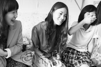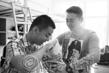 | 一说家乡事儿,三位东北姑娘就笑个不停。 本报记者 韩逸 摄 |  | 贾伟(右)给同学吃特产“花花”。本报记者 韩逸 摄 |
