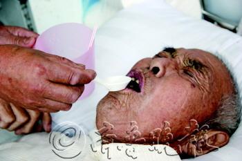 | 被病痛折磨的老人每隔一小会儿就得喝水润喉。即使这样,他还是一心记挂着他的“孩子们”。