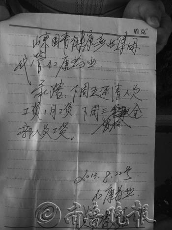 本报9月1日热线消息(记者 赵磊 王琳)近日,市民于女士向记者反映,包括她在内的30名工人在经济开发区一家药企做工4个月后被集体辞退,但是厂方一直拖欠着部分工资不予支付。8月30日,距离被辞退已经过去一个月的时间,30名职工再次来到该药企讨要工资,却还是空手而归。 8月30日下午,记者在经济开发区见到了于女士等十余位讨薪的下岗工人。“我们总共30多个人,上午去国青集团要工资,他们还是不给,很多人已经回家了。”于女士告诉记者,在2013年4月份,他们被国青健康产业集团一位张姓负责人招聘来,到仁康药业工作,准备参与生产一批药物。当时承诺的是半年以后签劳动合同,基本工资是1600元还有各种岗位补贴。然而,7月30日,国青集团的这位负责人告诉他们,因为药品的批号、批文没有申请下来,所以仁康药业不能生产这批药物了,只能将他们辞退。“为了准备生产这批药物,这四个月我们一直在车间做前期工作。”于女士说,因为没有正式开始工作,所以他们每个月只领1600元的基本工资。 被辞退时,有一部分人被拖欠了两个月工资,还有一部分人被拖欠了一个月工资。国青集团的张姓负责人表示拖欠的工资将会在8月15日支付。等到8月16日,于女士等人发现工资卡并未有工资入账,于是找到国青集团。张姓负责人先是说8月21日发工资,到了8月21日又推到8月30日,并且写下了“承诺书”。然而,8月30日上午,于女士等人第三次来到国青集团时,该负责人已经出差在外,公司仍然没有支付拖欠的工资。 随后,记者来到国青集团。该公司一位副总告诉记者,仁康药业负债1.6个亿,国青集团是债主之一。原本他们准备帮仁康渡过难关,招聘了于女士等人打算恢复生产。然而,仁康药业的老板在3个月前销声匿迹,药物的生产批号、批文也没有批下来,他们只能辞退临时招来的员工。本来拖欠的工资应该及时发放,但是国青集团的账户被银行冻结,一直没能解封,而且银行贷款也没能批下来,所以公司资金非常紧张。“国青的职工也已经两个月没发工资了。”这名副总称,如果公司账户上有钱,他们会尽快将拖欠的工资补上。
