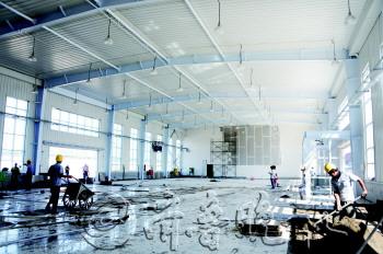 | 9月1日,火车站临时站房进入内部精装阶段,候车大厅内工人正在铺设地砖。 本报记者 马志勇 摄 |