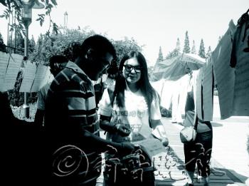 | 1日,一名志愿者在汇泉广场劝阻一名吸烟者。 杨林 摄 |