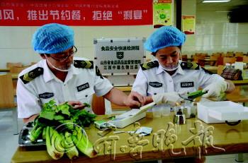 | 执法人员现场检测餐具洁净度是否超标。 潘旭业 摄 |  | 执法人员现场检测蔬菜中是否有农药残留。 潘旭业 摄 |  | 新学期开始,青岛开发区45个偏远村庄里的孩子终于坐上校车了,孩子们都非常高兴。 潘旭业 摄 |