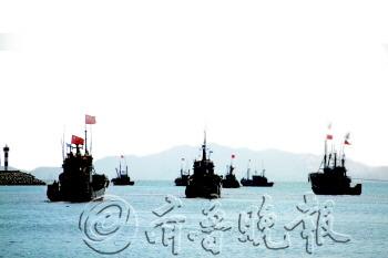 图为1日中午,正式开海后,金家沟码头的渔船结伴驶向大海,寻求秋天的收获。 本报记者 刘涛 摄