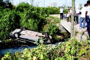 一轿车拐弯时翻进水沟