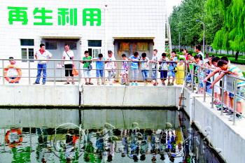 | ◥8月30日,本报组织小记者走进污水处理厂和环保局参观学习。图为,在污水处理厂,小记者们参观污水处理过程。 本报记者 李军 摄