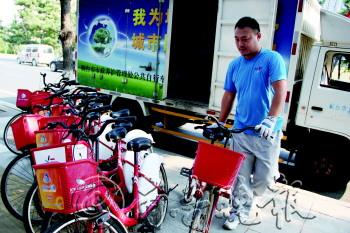市政养管处公共自行车管理中心工作人员在对公共自行车进行例行调度。 本报记者 韩逸 摄