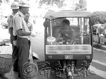| 执法人员对三轮车进行例行检查。 本报记者 王保珠 摄 |