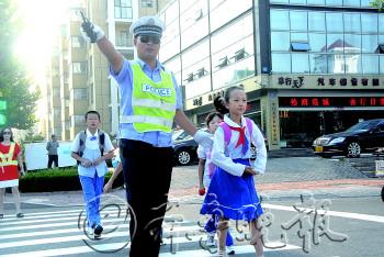 9月2日早上七点半,日照市公安局交警直属大队民警在金海岸小学门口开展护学活动。当天,全市中小学校全面开学,直属大队“牵手斑马线”爱心护学在六所学校也准时“上岗”,来自牵手志愿者、义工、爱心家长等近百人参加了“第一班岗”。