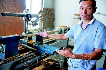 林善龙向记者介绍公司研究开发的数控木工车床。