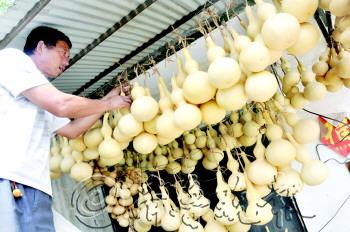 文/片 本报记者 邹俊美 聊城葫芦雕刻是国家级非物质文化遗产,这些用来雕刻的葫芦大多产自东昌府区堂邑镇。在聊城聊城市东昌府区堂邑镇路庄村,这里几乎每家每户都种葫芦。 9月2日,记者走进路庄村,不少村民正在葫芦地里忙着摘葫芦。虽说今年很多葫芦都被淹死了,但路庄村的村民家院子里房顶上还是有很多正在晾晒的葫芦。 “现在葫芦陆续熟了,摘下葫芦后还有很多工序要做,首先要去皮,然后清洗,最后是晾晒。”村民路宗革说,别看今年减产,很多种植户也不少挣钱。 “种常规的葫芦挣不了多少钱,现在都在寻找新品种,这个满天星是法国引进的品种,一个能卖到两三千。”村民路福建拿着一个葫芦说道。 以前种的葫芦中偶尔出个怪胎,长成奇形怪状的,村民都把它扔掉,后来发现,越是奇形怪状的越卖的价钱高,现在很多村民采用特殊手法,让葫芦长成其他形状,有的还专门买来模具,给刚开始长的葫芦带上,让葫芦按照模具的样子长,现在都可以卖很多钱。路福建说,刚开始村民光等着商户上门来收购葫芦,价格被压得很低,现在村民也开始想销售渠道了,有的在淘宝网上卖葫芦,有的自己深加工,葫芦身价增加,村民的腰包也鼓了起来。