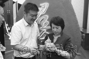 ◤近日,世界顶级知名奢侈品集团LHVM下属的首个白酒品牌文君酒,在济南举办了品酒会。中国著名白酒品评专家、文君酒首席品酒师吴晓萍,亲临现场,教给济南20位消费者代表如何在白酒中调出果香的味道。图为:消费者亲手调好酒样,请吴晓萍大师签名纪念。