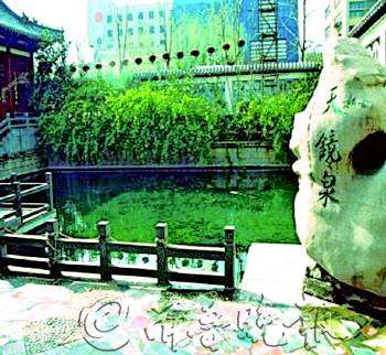 天镜泉位于五龙潭景区西南隅,水面平静如镜,日月星云倒映池中,如天垂镜。