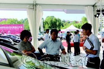 | 齐鲁晚报莒县车展现场,销售顾问向前来购车的市民推荐车型。 |