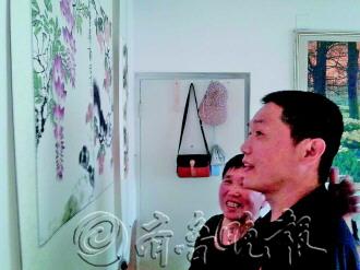 | ▲安文花(左)赞赏儿子(右)画作得好。 记者 冯琳 摄 |