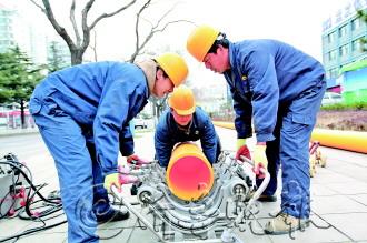 | ▲青岛路附近,威海港华燃气有限公司工作人员正在进行铸铁管改造。