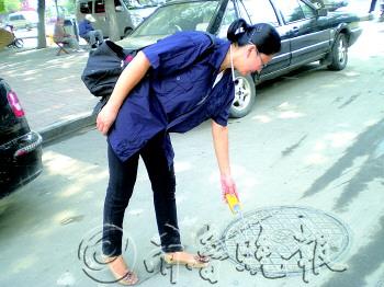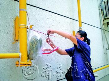 | 张夕英解下居民挂在燃气管道上的杂物。 |  | 张夕英检测路面上的阀井。 |
