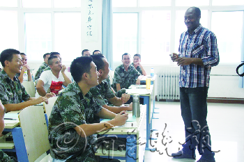 滨州学院外教正在和飞行学院的学生进行互动学习。
