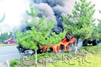 本报9月9日讯(记者 吕修全 通讯员 祝令强) 8日早,309国道文登市大水泊镇一加油站附近发生一起车辆自燃事故。一辆拉载苹果残渣的大货车在行驶途中,轮胎突发自燃。司机及路过交警先后使用4个灭火器扑火,仍不能阻挡火势蔓延。消防官兵赶到扑灭火灾,货车6只轮胎被烧毁。 8日早,文登市交警大队四中队民警在309国道例行巡逻。走至大水泊镇屯杨家加油站附近时,发现路边一大货车右后侧车轮下浓烟滚滚,很快冒出黄色火苗来。司机及另一名男子正手持灭火器扑火,但效果甚微。 民警立即驱车上前,在加油站借来两个灭火器,开启灭火器扑向起火点并保护车头免受过火。但灭火器用完后,仍不能扑灭火源。交警随即在火灾现场设置了警示标志,疏导过路车辆安全通行。文登消防官兵赶到现场后,出动水枪迅速扑灭车辆起火。后经检查,该车右后侧3排6只轮胎全部烧毁,该车其他部位没有损坏。 据司机讲,其驾车满载一车制果汁后剩余的苹果残渣,沿309国道由西向东行驶至事发路段时,可能因轮胎摩擦生热,致轮胎发生自燃。