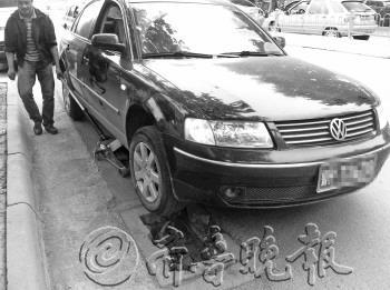 9日上午10时多,在卫育路机动车道上,一辆轿车将要驶过一个下水道盖时,下水道盖突然下陷,轿车一个车轮被卡住。