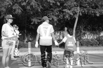 每天护学四次, 一次至少半小时 9月3日早晨7点,日照市济南路小学。像往常一样,交警直属大队事故科民警刘旭日和志愿者李帅早早来到学校。他们在距校门口50多米远的马路两侧设好隔离带,拉上警戒线。过了一会儿,又有近10位志愿者也赶到学校。 7点10分左右,送孩子的私家车和自行车陆续来了。家长们并没有把车停在学校门口,而是自觉将车停在了隔离带外。家长放下孩子后,志愿者迎过去接上孩子,家长随即开车走了。 刘旭日维持着交通秩序,志愿者护送孩子们走过斑马线时,路上的车辆主动停了下来,直到学生走到学校门口。 7点半左右,送孩子的车辆达到了高峰期,志愿者来回穿梭于斑马线两侧,车辆则井然有序地通过了学校门口,学校周边没有出现交通阻塞。 下午4点半左右,刘旭日和志愿者们又来到学校门口。一过5点,孩子们走出了校门,过斑马线时没有一个乱跑的,都自觉排起了队,由志愿者护送。 另外十多个志愿者中,有学生家长,有大学生,他们也和刘旭日一样,每次上学、放学,都来到学校门口护学,至少半个小时。 每天早晨,像他们这样在日照各个学校门口护学的志愿者还有2000多人。他们中有的每隔一周护学一次,有的则坚持每天都去。 “爱心护学” 在中小学推广 市民杨英的孩子现在济南路小学上三年级。“原来开车送孩子时,把车停到路边,送孩子到学校门口再回来,发现路早被车堵得水泄不通,想要再出去太难了,至少得十多分钟。”回忆起以前送孩子上学的经历,杨英说。 为了解决这一问题,2011年以来,交警部门在交通拥挤现象最为突出的新营小学,开展“牵手斑马线”爱心护学活动,以后逐步推广到了其他中小学。 日照市交警支队宣传科科长丁兆专说,一开始主要是在社会上招募志愿者,多数是大学生。“好多家长不是很理解,为什么不让把孩子送到校门口?出了问题谁负责?因此很不配合。” “别说其他家长,就是我家亲戚也不理解我,说我闲得没什么事,怎么去干这个;好些家长也很不配合,我们让他们把车开到换乘点,他们无动于衷,径直把车开到学校门口。”30多岁的家庭主妇贺照霞说,她的孩子在济南路小学四年级三班读书。 贺照霞说,“我没有什么工作,平时主要的事就是接送孩子上下学,看自己一个孩子也是看,多看几个也一样,反正有时间,为什么不做点好事呢?” 交警与学校联合动员家长参与护学,并对志愿者进行统一培训,统一装备。一段时间后,护学活动得到了越来越多家长的理解。