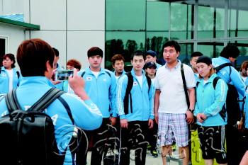 | 9月10日,韩国举重运动员在平壤机场合影。 据新华社 |