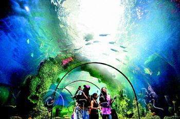 | 10日,在济南大明湖景区湖底的海底世界,市民们正在走过“海底隧道”,被头顶及身旁游过的各种鱼儿所吸引。
