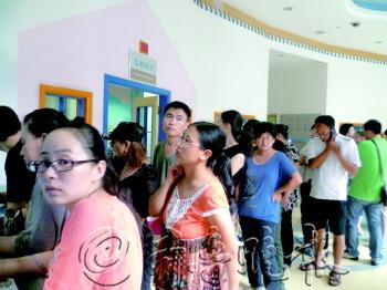 | 10日下午1点多,毓璜顶医院里家长们给孩子排队挂号。 本报记者 宋佳 摄 |
