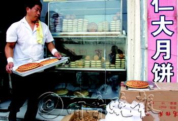 | 10日上午,尹先生将刚刚出炉的大月饼放到屋外晾干。 本报记者 王小会 摄 |