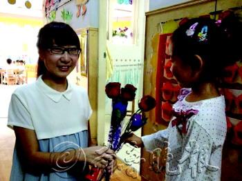 教师节到了,广和幼儿园中班小朋友刘茉稀给老师送上玫瑰,并大声地对老师说“节日快乐”。