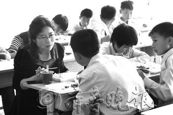 | 9月10日,蔺胜娟在学校陪学生一起吃午餐。